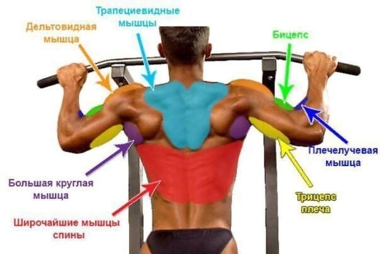 Преимущество занятий на перекладине состоит в том, что в зависимости от необходимости, можно давать нагрузку как на конкретные мышцы, так и на всю мускулатуру тела. С помощью этого спортивного снаряда можно прокачать: