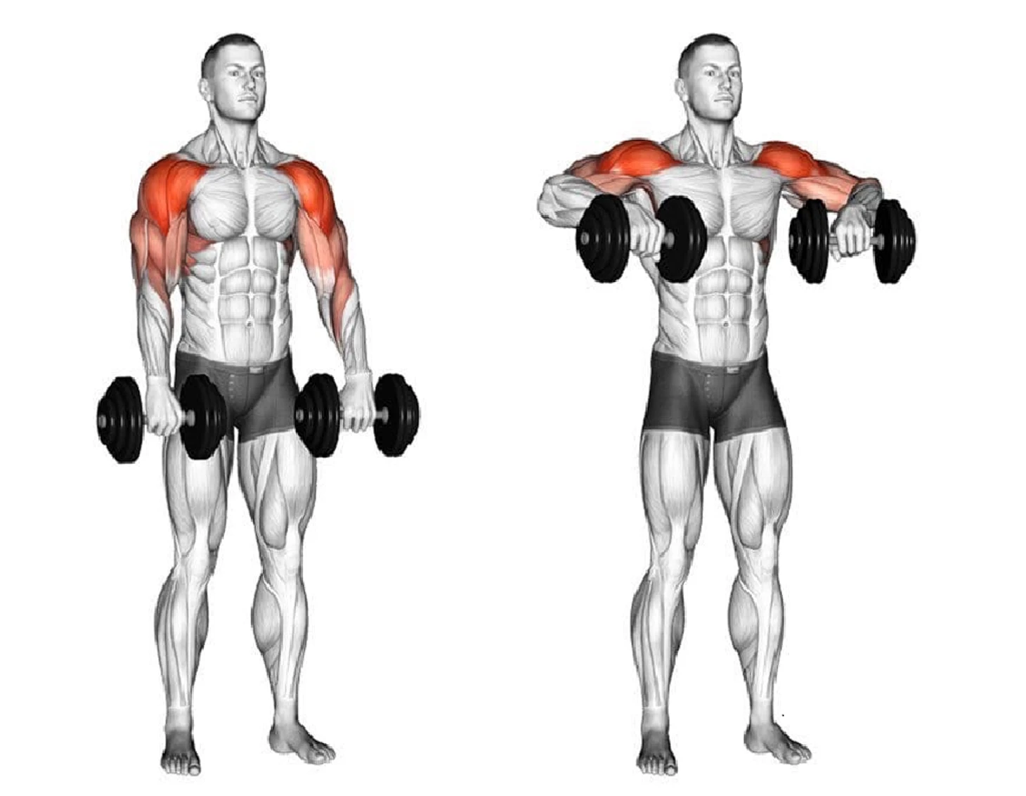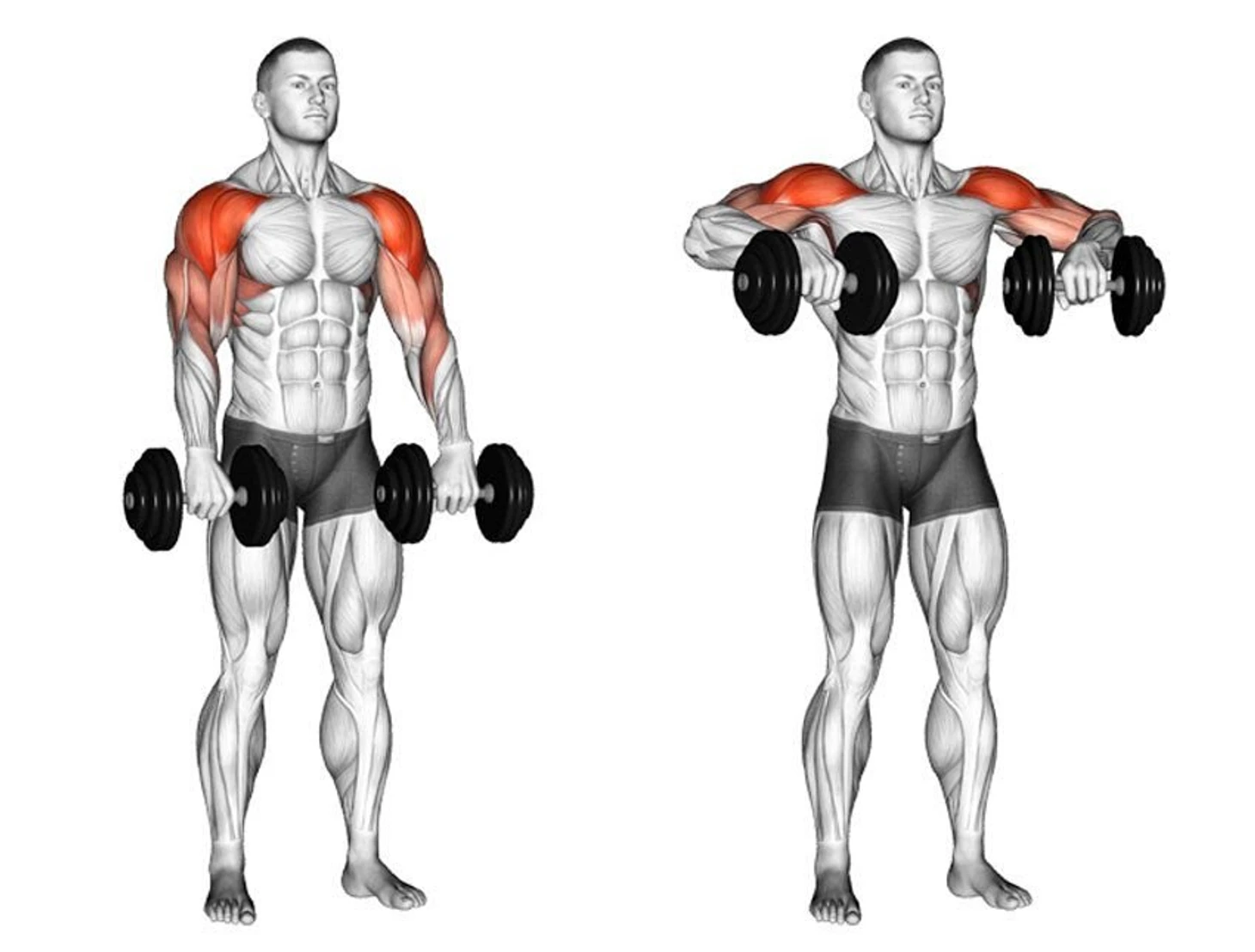 В этом случае мы качаем плечи в области средних пучков дельты. Техника выполнения состоит из пяти основных действий:
