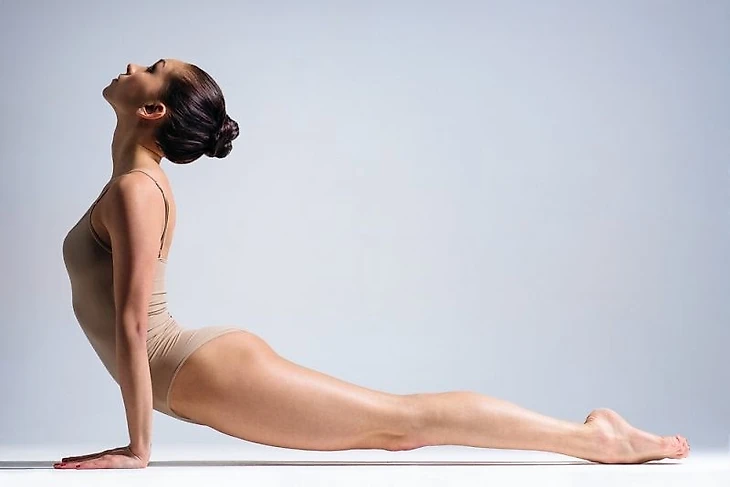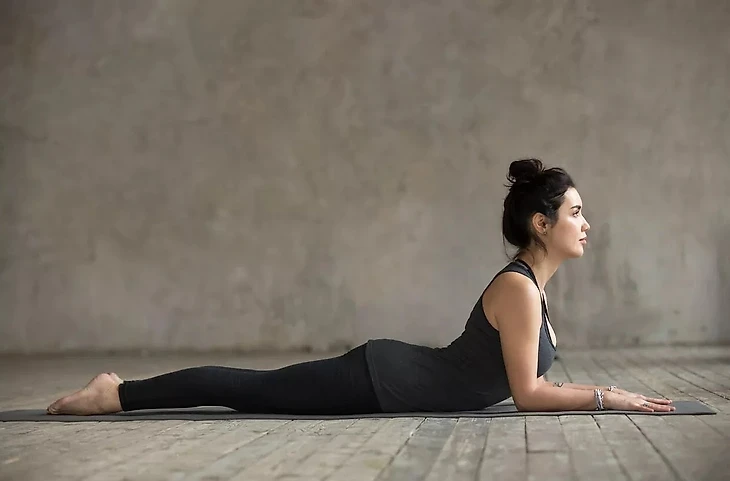 Расположитесь на полу на животе, удерживая упор пальцами ног. Выдыхая, плавно выпрямите руки, корпус тела и голову поднимите. Ощутите, как выгибается ваш позвоночник. По возможности, оторвите от поверхности пола бедра и живот. При выдохе снова лягте на живот, согните локтевые суставы и опустите голову. Повторите движение на вдохе-выдохе 7-8 раз.
