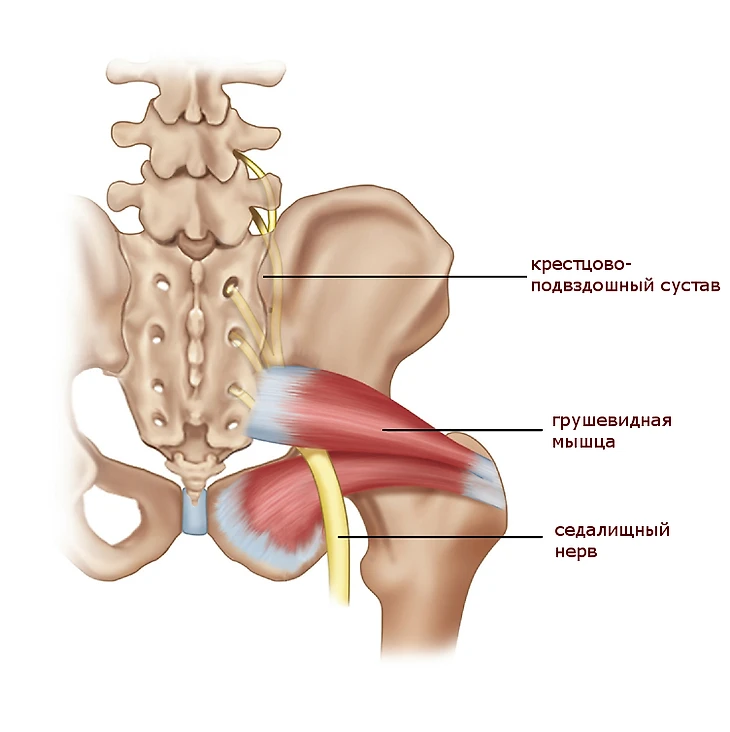 Грушевидная мышца относится к внутренней группе тазовых мышц и отвечает за наружную ротацию бедра. Как вы можете видеть на рис.1, она имеет сравнительно небольшой размер, а чем меньше мышца, тем быстрее она укорачивается и уплотняется, из-за чего спазмируется. А спазм грушевидной мышцы вызывает защемление седалищного нерва, который проходит ровно под мышцей (рис.2).