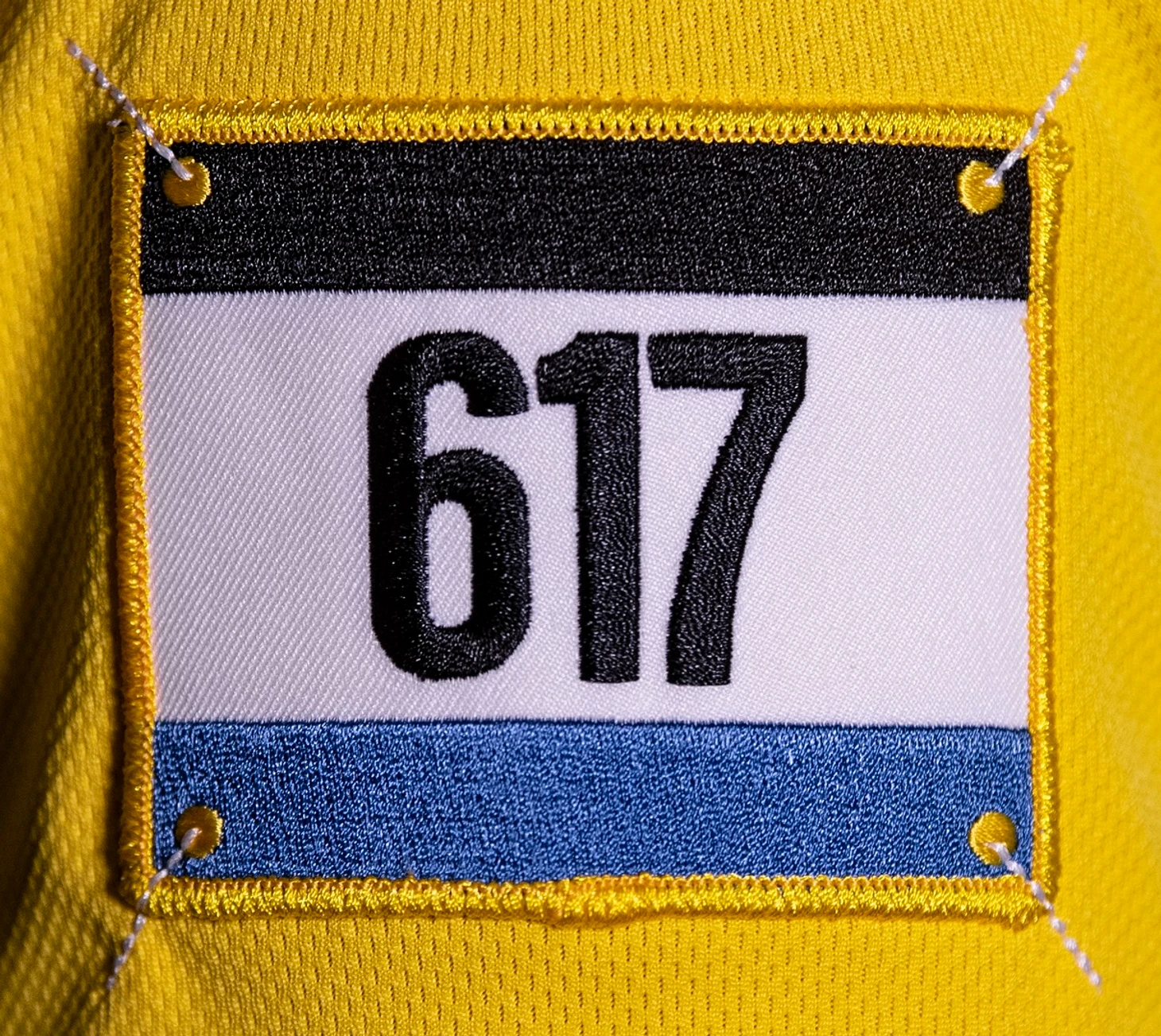 На рукаве можно увидеть даже вышитые булавки, которые «крепят» номер к одежде.