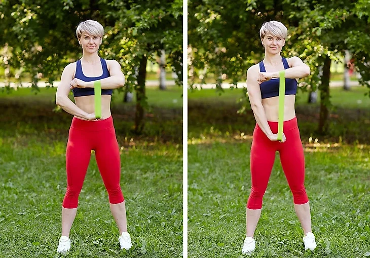 Правой рукой ухватите один край резинки для фитнеса. Другой край наденьте на предплечье левой руки. Подведите левую кисть к правому плечу. Правый локтевой сустав прижмите к корпусу. Делая выдох, разгибайте руку, стараясь как можно сильнее растянуть эспандер. Вдыхая, расслабьте конечность и вернитесь в начальное положение.