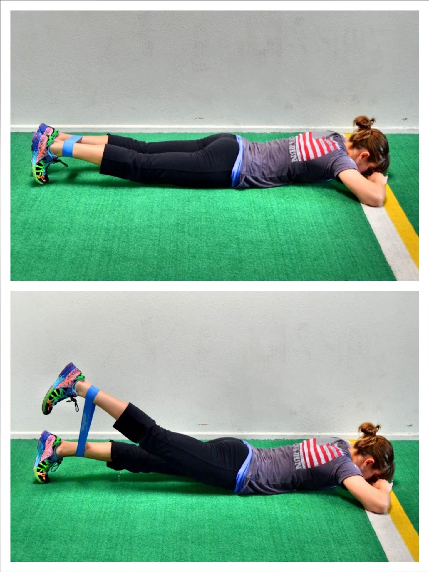Расположитесь на лежа на полу на животе. Фитнес-резинка размещена на голенях. Поочередно поднимайте и опускайте ноги, стараясь максимально растягивать эспандер.
