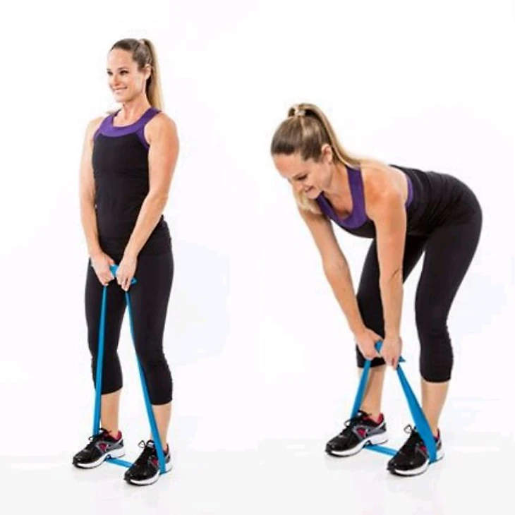 Наклонитесь вперед, слегка сгибая колени, ослабьте натяжение тренажера (на вдохе). На выдохе разогнитесь, задействуя в работе ягодичные мышцы. Вес тела при выполнении наклона должен смещаться на пятки, спина прямая.