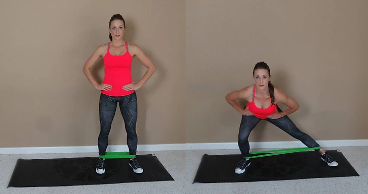 На выдохе шагните в сторону, приседая до параллели бедра с полом. Делая вдох, вернитесь в начальную позицию, подтягивая обратно отставленную ногу. Проделайте то же самое на другую конечность.