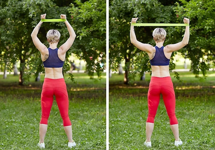Поднимите руки вверх, фитнес-резинку расположите на запястьях. На выдохе как можно сильнее разведите конечности в стороны, растягивая тренажер. На вдохе осторожно ослабьте натяжение и вернитесь в исходное положение.