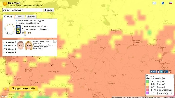 Отследить показатели интенсивности ультрафиолетовых лучей (УФ-индекс) можно на сайте nesgori.ru. Сайт показывает интенсивность в разные часы дня и сколько времени с каким типом кожи можно находиться на солнце в определенный час.