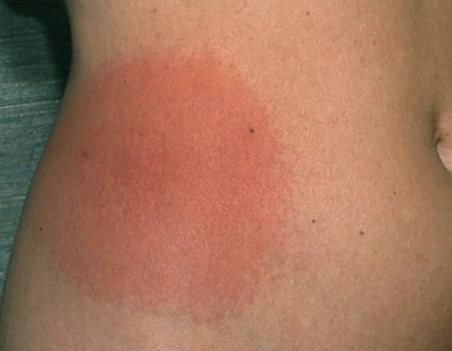 Первая стадия заболевания похожа на аллергическую реакцию, но в этом случае покраснение на коже возникает на 3-30 день после укуса клеща – чаще на 7-14 день. На коже появляется мигрирующая эритема – такое покраснение, в отличие от аллергии, не будет уменьшаться – только увеличиваться в размерах. Чаще всего мигрирующая эритема со временем становится светлой в центре и красной по краям, но не всегда – иногда она может быть целиком красной.