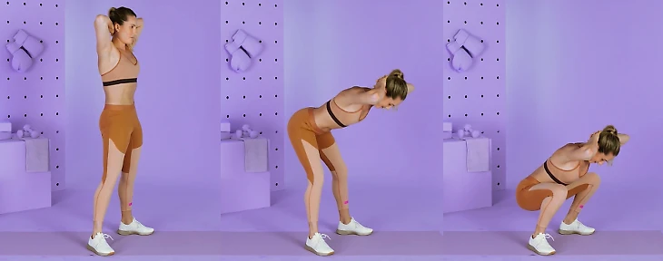 Встаньте прямо, ноги чуть шире плеч, носки слегка направлены наружу. Руки заведите за голову. Отведите бедра назад и опустите корпус вниз, пока верхняя часть тела не станет почти параллельна полу. Из этого положения сделайте приседание. Возвращайтесь в исходное положение в обратной последовательности движений. Это одно повторение. Выполните 12-15 повторений.