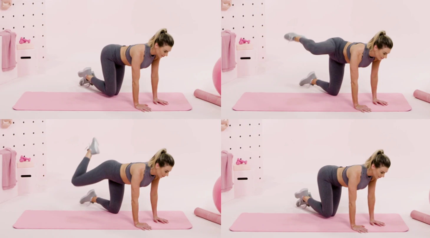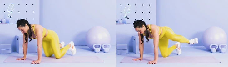 Встаньте на четвереньки. Отведите согнутую в колене правую ногу в сторону. Удерживая равновесие, сделайте круговое движение назад и вверх, а затем вернитесь в исходное положение. Выполните 12-15 повторений на каждую ногу.