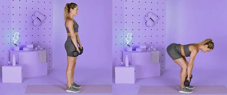 Встаньте прямо, удерживая в каждой руке по гантеле. Руки расположены перед бедрами ладонями к себе. Отведите бедра назад, слегка согните ноги в коленях и опустите гантели к полу. Напрягите ягодицы и толкающим движением стопами от пола вернитесь в исходное положение. Выполните 12-15 повторений.