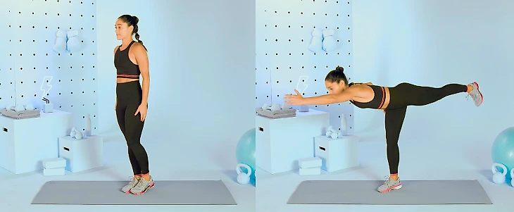 Встаньте прямо, ноги вместе, руки по бокам. Плавно наклоните туловище вперед и одновременно отведите левую ногу назад. Левая рука вытянута вперед, корпус параллелен полу. Вернитесь в исходное положение. Выполните 12-15 повторений на каждую сторону.
