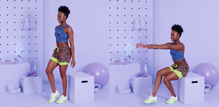 Встаньте спиной к ящику или стулу. Перенесите вес на левую ногу, правая ступня едва касается пола, руки по бокам. Согните левое колено, отведите бедра назад и присядьте на одной ноге, пока ягодицы не коснутся ящика. Руки вытягиваются вперед. Как только коснетесь ящика, вытолкнитесь через левую ногу, чтобы вернуться в исходное положение. Выполните 12-15 повторений на каждую ногу.