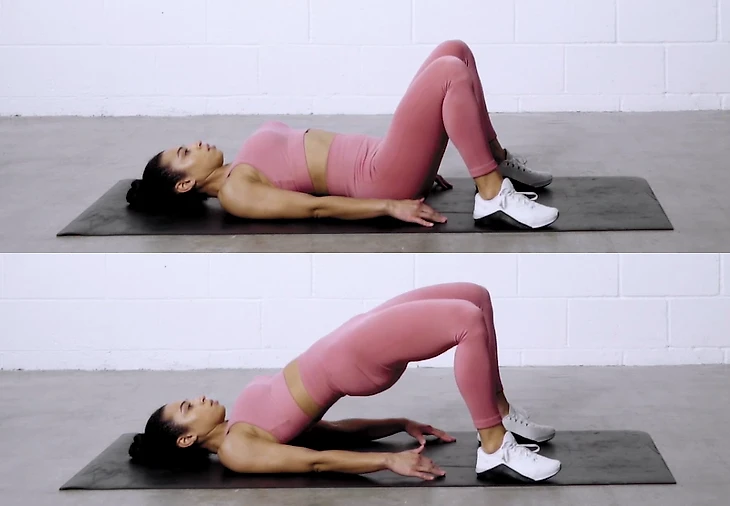 Лягте на спину, ноги согнуты в коленях, руки вдоль туловища. Поднимите бедра вверх, пока тело не образует прямую линию от шеи до колен. Задержитесь в этом положении в течение двух секунд и плавно опуститесь обратно. Выполните 12-15 повторений.