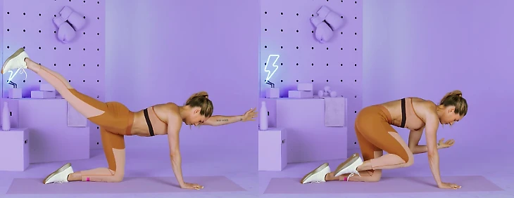 Встаньте на четвереньки, ладони под плечами, колени под бедрами. Втяните живот, затем вытяните левую руку и правую ногу, пока они не станут параллельны полу. Удерживая спину ровно, поднесите локоть к колену, а затем вытянитесь обратно. Это одно повторение. Выполните 12-15 повторений на каждую сторону.
