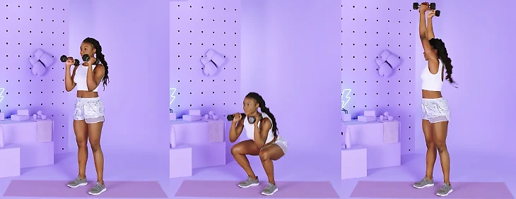 Сделайте приседание. При возвращении в исходное положение поднимите гантели над головой и одновременно поверните корпус влево. Опуститесь обратно в присед и при подъеме выполните толчок гантелей и скручивание вправо. Это одно повторение. Выполните 12-15 повторений.