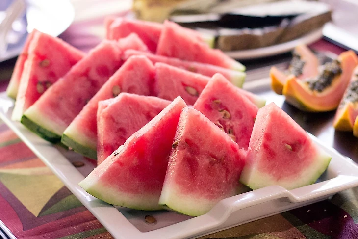 Так как ягода более чем на 90 % состоит из воды, то отлично подходит для восполнения жидкости в организме. Особенно в жару, когда с потом мы теряем много влаги и микроэлементов, вместо больших объемов напитков можно съесть несколько долек арбуза.