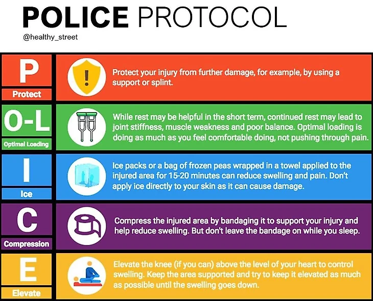В таком случае нужно использовать универсальный протокол POLICE – это 5 основных правил лечения практически любых травм.