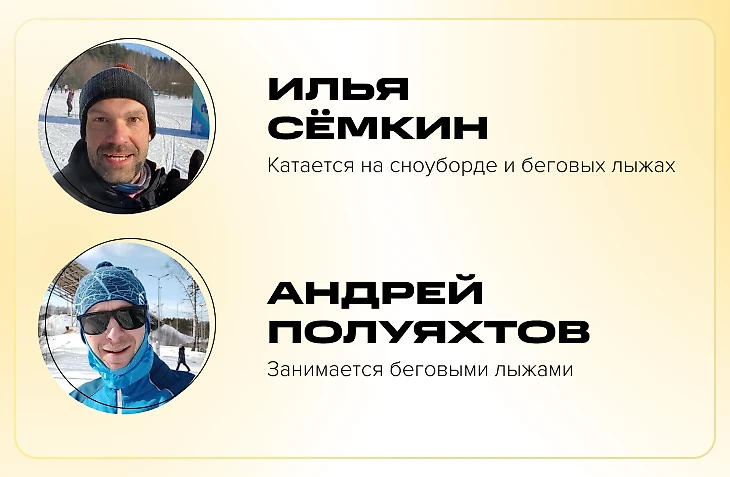 Илья Сёмкин, 43 года, на сноуборд встал четыре года назад, также катается на беговых лыжах: «Круто видеть, как тренируются твои друзья, и соревноваться с ними. Создавать челленджи и приглашать туда других или участвовать в чужих и прогрессировать, накручивая все больше километров каждый месяц... Это очень захватывает. Приведу простой пример. Как-то я заметил, что один из моих друзей начал слишком часто тренироваться. Оказалось, он готовился к лыжному марафону – и через месяц я тоже пробежал свой первый полумарафон».