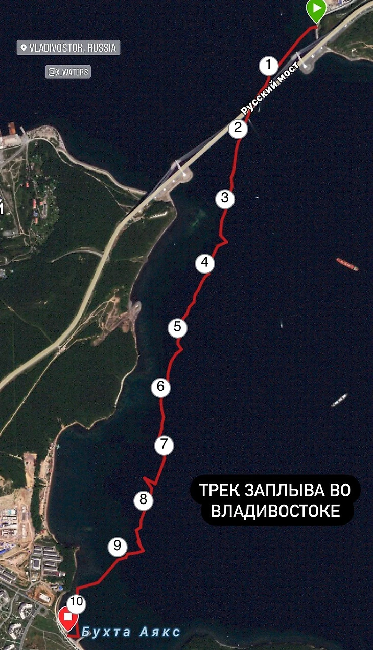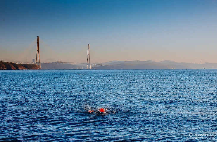 Пока мы плыли, всходило солнце, сиял подсветкой мост. Корабли тихоокеанского флота перекрывали пролив Босфор Восточный для нас. На финише уже совсем рассвело.