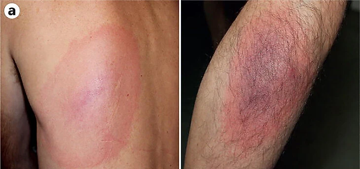 Первым и самым ярким симптомом болезни Лайма выступает характерная кожная сыпь (эритема). Вокруг места укуса клеща возникает крупное красное пятно размером до 15 см, немного возвышающееся над уровнем кожи за счет уплотнения (отека) подкожной клетчатки. Сыпь может сопровождаться жжением, зудом или болью.