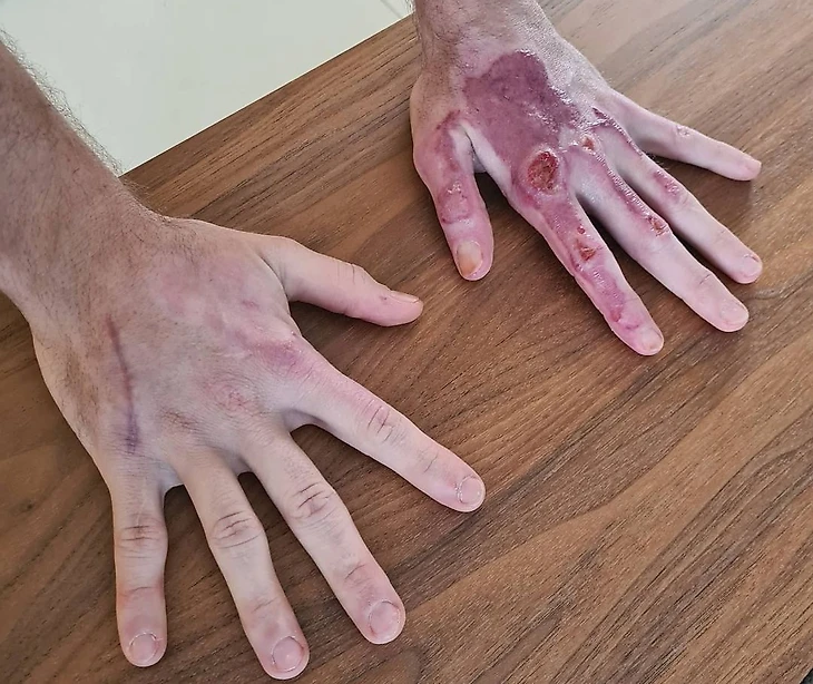 Спустя год Грожан выложил фотографии рук, где видны сформировавшиеся рубцы: