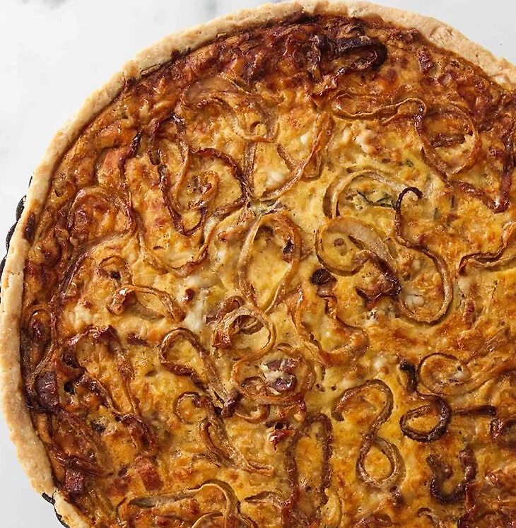 Лук нарезать полукольцами и обжарить до мягкости. Смешать с сыром, яйцом, сливками и специями. Выложить тесто в форму и влить луковую начинку. Запекать при 180 °C около 25 минут.