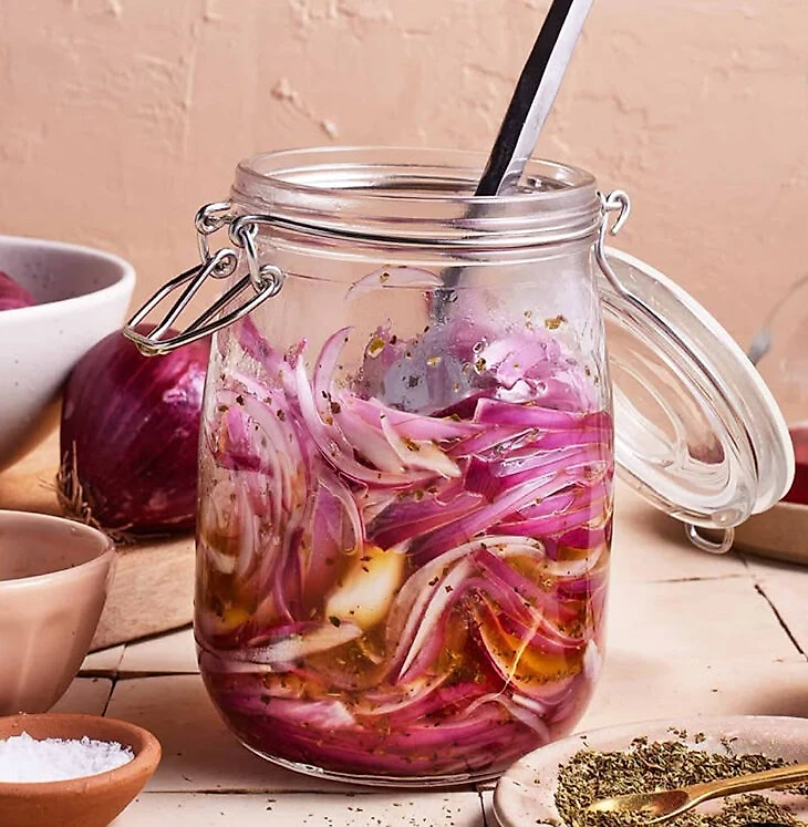 В салате маринованный лук заменяет обычный сырой – делает вкус более мягким и сбалансированным. Также он хорошо сочетается с пастой, яйцами и сэндвичами. Хранится в холодильнике до недели, а делается всего за 10 минут.