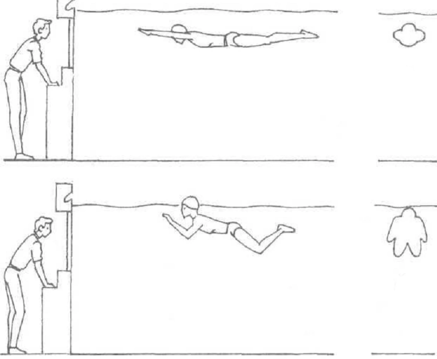 В идеальном варианте корпус, таз и ноги должны находиться в тени плеч. Для этого необходимо сместить центр тяжести вперед, то есть навалиться весом тела на плечи. Таким образом, используя плавучесть верхней части тела, можно разгрузить ноги, создать баланс и снизить сопротивление воды.