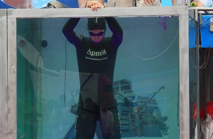 Том установил рекорд в рамках шоу в Китае в 2012 году, где он соревновался с еще одним фридайвером в вертикальных камерах, заполненных водой.