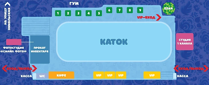 Дополнительные услуги: раздевалки, камера хранения, туалет, бесплатный Wi-Fi, заточка коньков, фудкорт, медпункт.