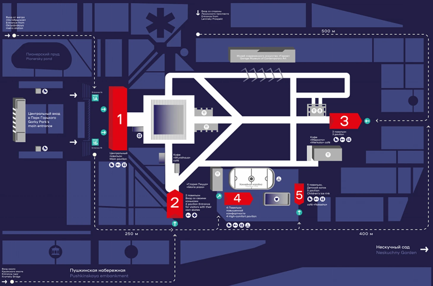 На катке расположено пять павильонов: