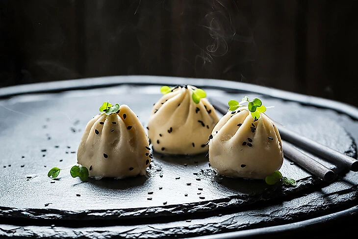 Посыпать рабочую поверхность мукой и выложить на нее примерно треть теста. Сформировать колбаску, разделить ее на фрагменты толщиной примерно 3 см, скатать колобки размером с грецкий орех, расплющить ладонью и раскатать в лепешку диаметром 10–12 см. Тесто должно быть раскатано тонко. По центру каждой заготовки выкладываем по 1 ст. л. начинки. Слепить манты: соединить два противоположных конца сверху, оставшиеся – по бокам, чтобы получился конвертик.