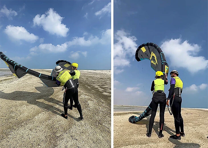 Начальная позиция кайта перед катанием – C, поэтому мы помогали друг другу и устанавливали кайт на земле в нужную позицию, когда ученик вместе с инструктором находился в воде. В руках ученик держит бар – перекладину, с помощью которой можно управлять кайтом.