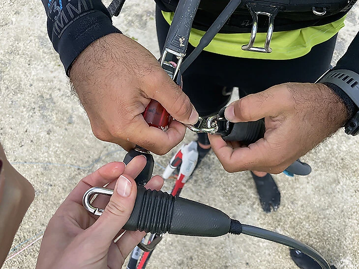 Мы пробовали держать кайт по ветру и устанавливать его во все эти 3 позиции. Потом, чтобы перейти к управлению кайтом в тех же условиях, что во время катания, нужно было пристегнуть кайт к спортсмену. Делается это с помощью специальных тросов.