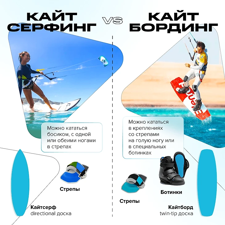 «Кайтсерфингом принято называть катание с кайтом по волнам, при котором используется доска геометрии directional. Этот снаряд очень схож с классическим серфбордом. Кайтбординг – катание с кайтом по волнам или на гладкой воде на кайтборде, в основном геометрии twin-tip.