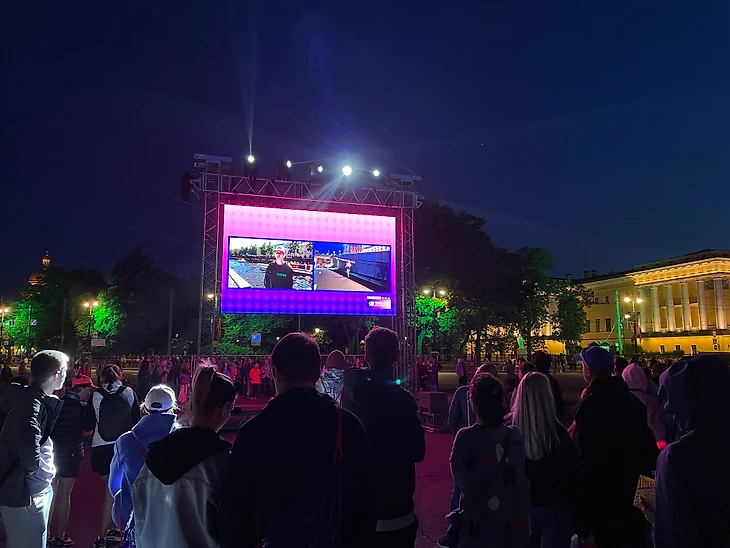 Куча народу наблюдает за трансляцией на огромном экране на Дворцовой
