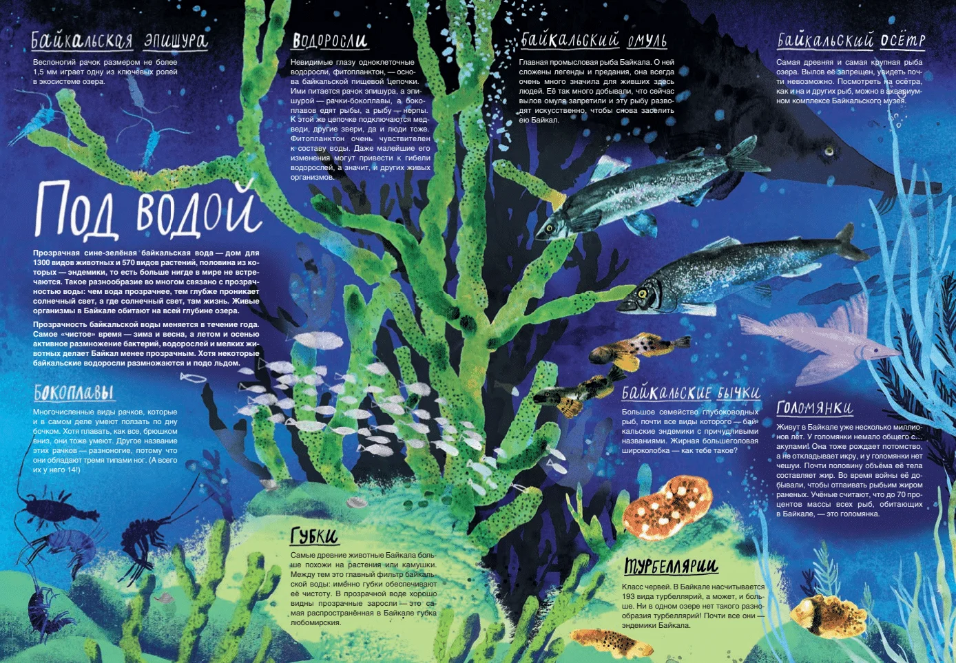 В ней собраны самые разные факты об истории озера, его характере и обитателях, маршрутах разной степени сложности и проблемах, которые стоят перед Байкалом прямо сейчас. Несмотря на то что это не самая полная энциклопедия об озере, а лишь первое приятное знакомство, рассчитанное на детскую аудиторию, над проектом работали научные редакторы и байкаловеды, а партнер книги — фонд «Озеро Байкал».
