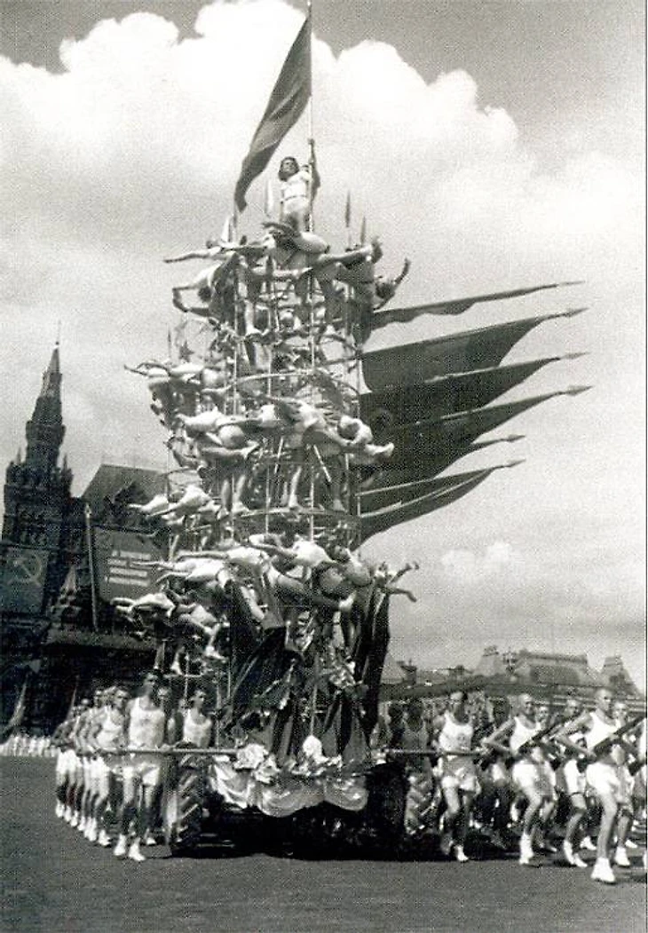 Понаблюдаем за колонной спортивного общества «Динамо» на первом в послевоенной Москве физкультурном параде, август 1945 года.