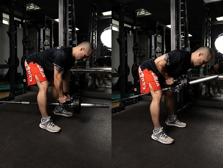 На выдохе тяните гриф к животу, сгибая руки в локтях и максимально сводя лопатки вместе в конечной точке.