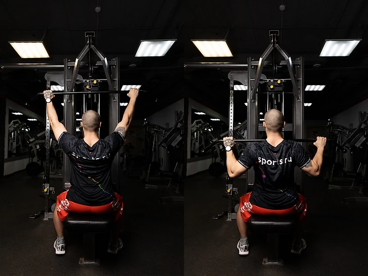 Тяга за голову – заведение локтей за спину увеличивает риск травмы вращательной манжеты плеча, а наклон головы вперед от рукоятки нарушает нейтральное положение позвоночника, которое соблюдается для безопасности позвонков во время силовых упражнений.