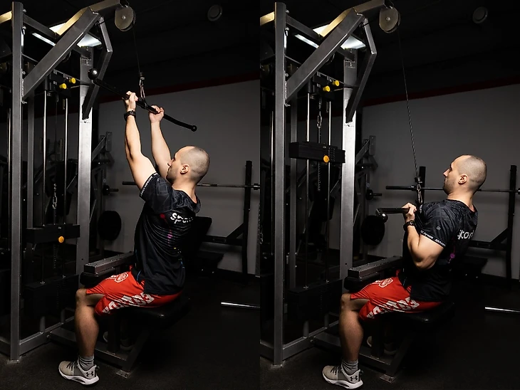 Первым движением сведите лопатки вместе, опустите их вниз и плавно начинайте тянуть вниз локти. При правильной ширине хвата в конечной точке локти практически коснутся корпуса. Если локти очень далеко от вашей талии, значит хват слишком широкий.
