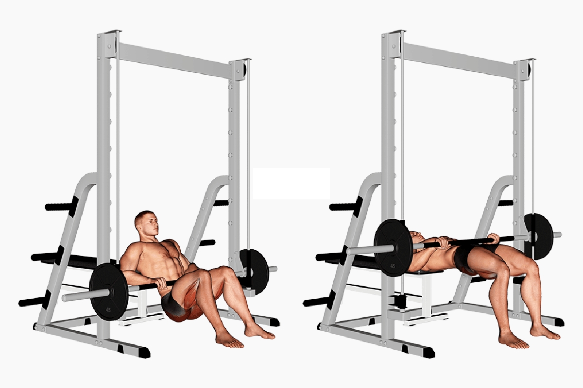 Попросите подать вам штангу, аккуратно положив ее на таз. Если попросить некого, попробуйте поднять вес так: пока сидите на полу, закатите гриф над бедрами – этот способ получится далеко не всегда из-за разницы между радиусом штанги и объемами бедер. Если такой закинуть штангу возможности нет – замените ягодичным мостиком в Смите (техника будет ниже).