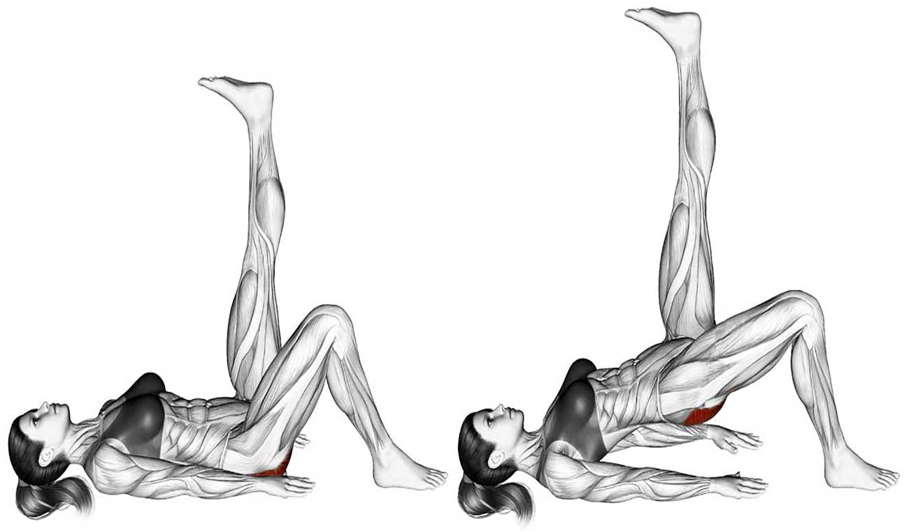 На вдохе опускаемся в течение 2-3 секунд в нижнюю точку, затем на выходе толкаем пяткой опорной ноги пол и поднимаем таз наверх.