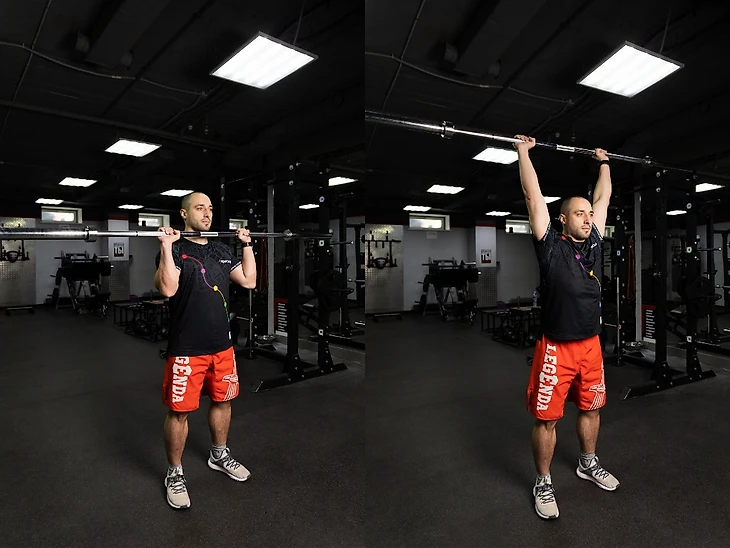 Армейский жим или жим штанги стоя считается одним из самых эффективных упражнений для развития плечевого пояса. Жим штанги стоя акцентировано воздействует на переднюю и среднюю дельтовидные мышцы, трапециевидную и в меньшей степени трицепс.
