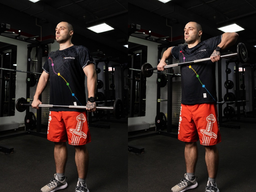На выдохе начинайте сгибать локти и тянуть именно локти вверх и в стороны. Штанга поднимется примерно до уровня центра груди, а локти будут на высоте плеч. В верхней точке кисти должны оказаться под локтями или чуть уже.