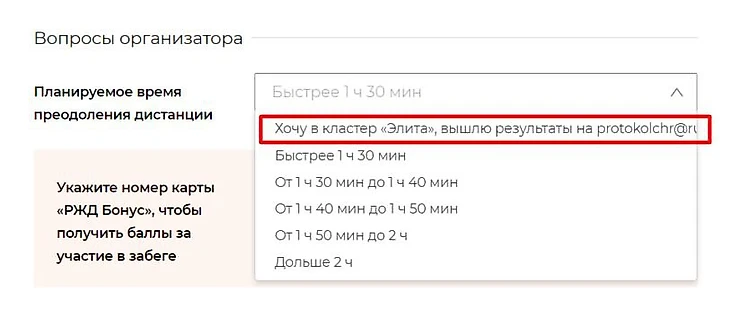 Для старта из элитного кластера необходимо сначала зарегистрироваться на старт через RussiaRunning, выбрав в пункте с ожидаемым временем пункт «Хочу в элиту». После регистрации нужно отправить заявку на электронный адрес protokolchr@russiarunning.com – до 23 августа. К письму приложить ссылку на протокол соревнования, где было выполнено квалификационное время, а также указать ФИО, дату рождения и электронную почту.