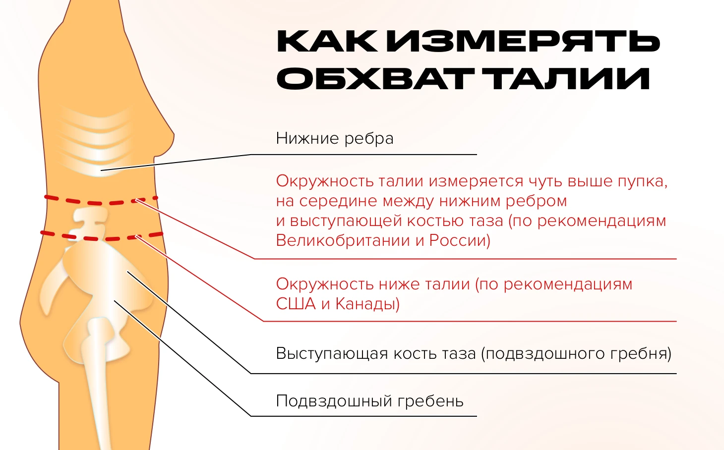 Согласно рекомендациям Центра по контролю и профилактике заболеваний США и канадского фонда Heart & Stroke выполнять замер стоит по линии тазовой кости. Тогда он будет точнее, так как в этой зоне окружность тела выше, чем в зоне талии.