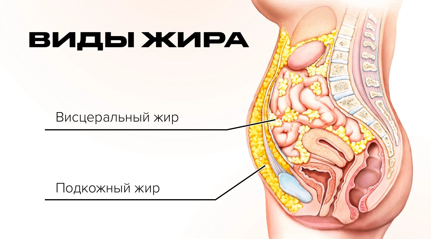 Жир в организме откладывается не только под кожей, но и вокруг внутренних органов. Такой жир называют висцеральным (от лат. viscera – «внутренности»). Несмотря на то, что висцеральный жир не виден внешне, именно он наносит наибольший вред здоровью – повышает риск сахарного диабета, артериальной гипертонии и рака.