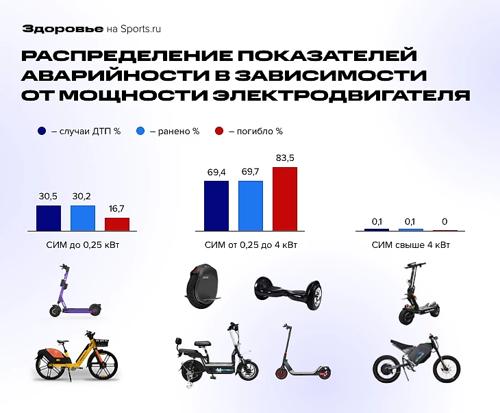Согласно данным Научного центра безопасности дорожного движения МВД, всего 30% ДТП приходится на маломощные СИМ – те самые прокатные электросамокаты и электровелосипеды, мощность мотора которых ограничена законом до 0,25 кВт.